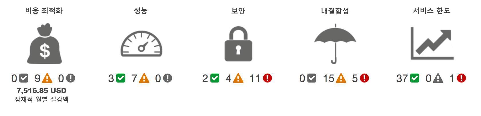 Trusted Advisor는 비용 최적화, 성능, 보안, 내결함성, 서비스 한도라는 5개 범주에서 결과를 AWS 모범 사례와 비교